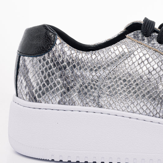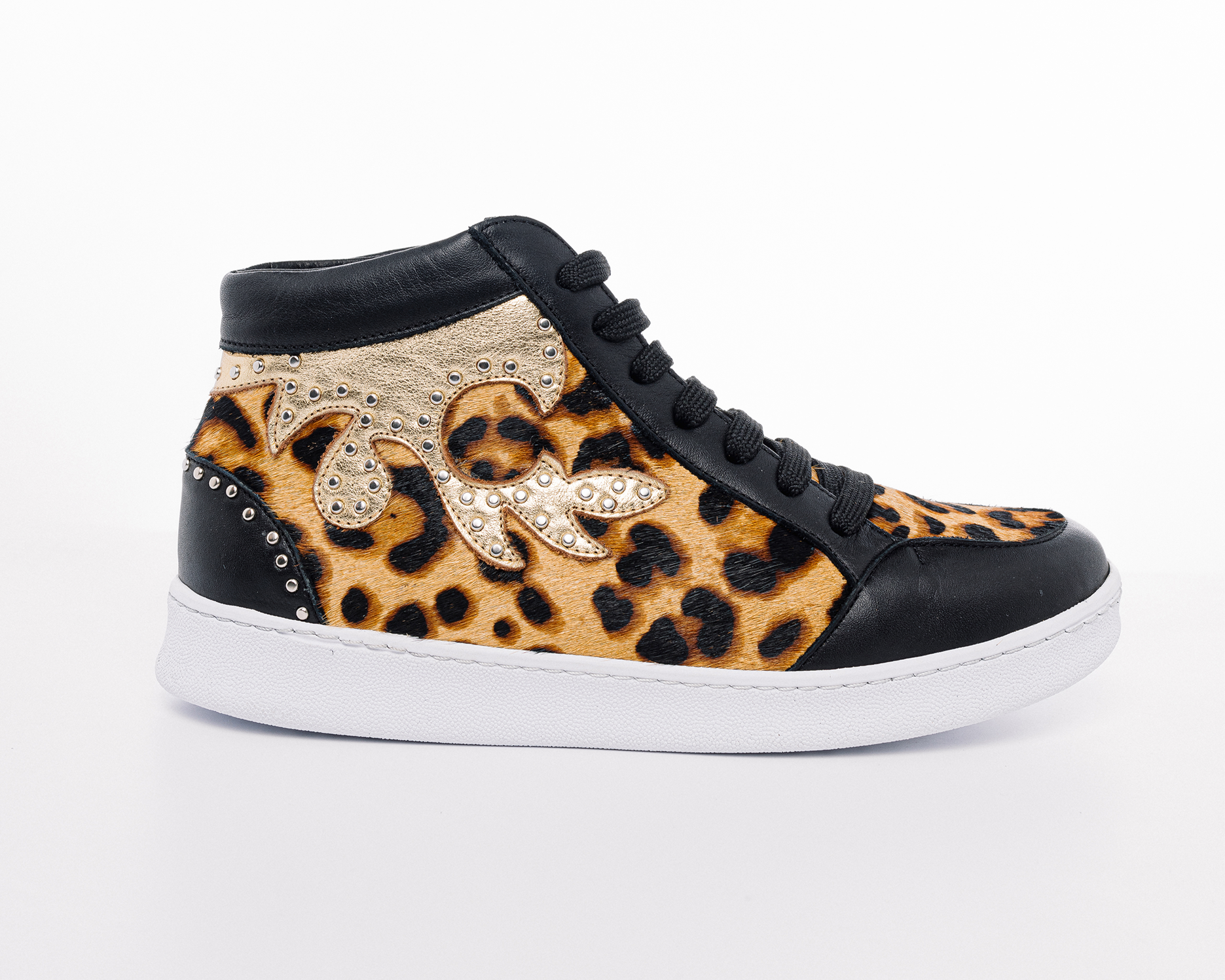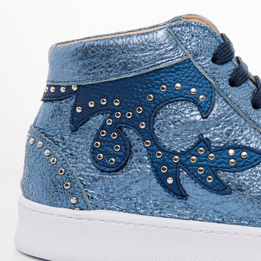 Hecho a mano con pieles de primera calidad en acabado azul brillante y textura animal print.