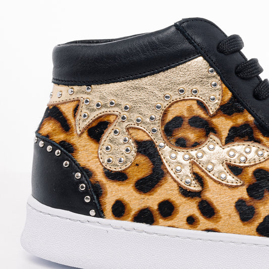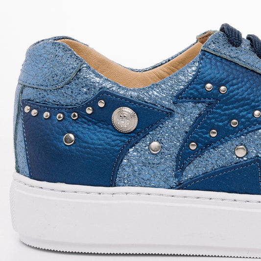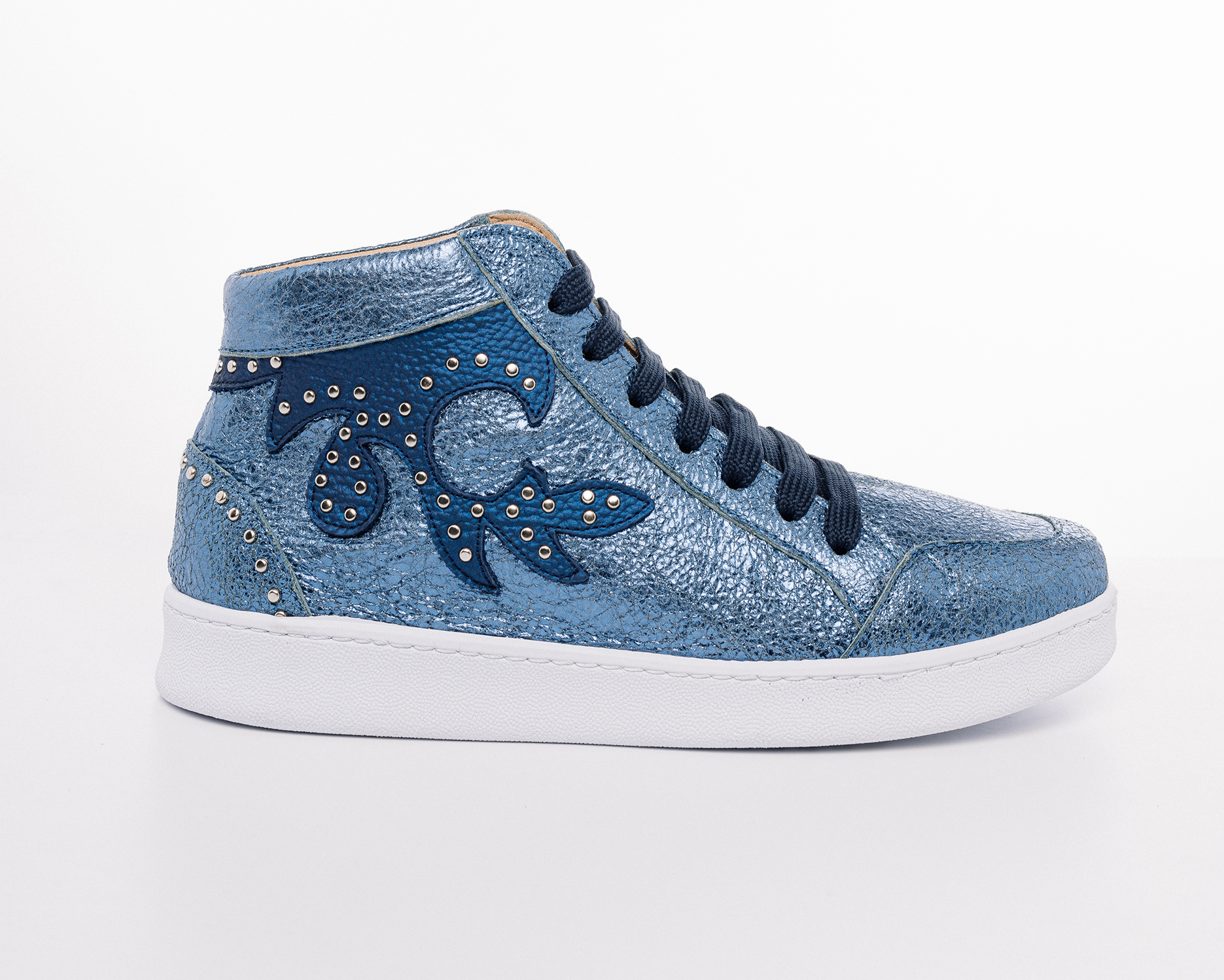 Hecho a mano con pieles de primera calidad en acabado azul brillante y textura animal print.